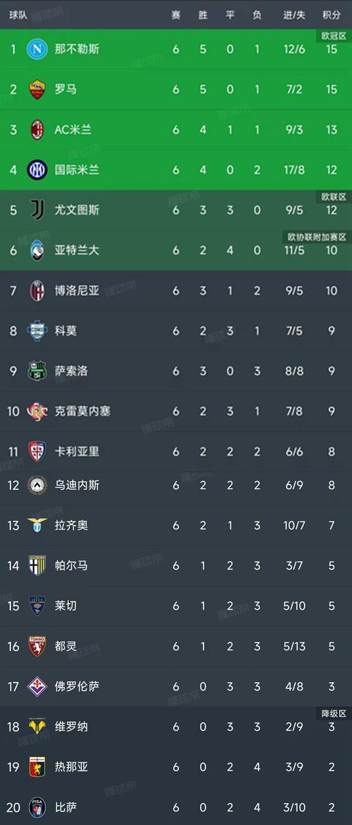 随着那不勒斯2-1逆转,尤文0-0闷平,意甲第6轮最新积分榜如下!